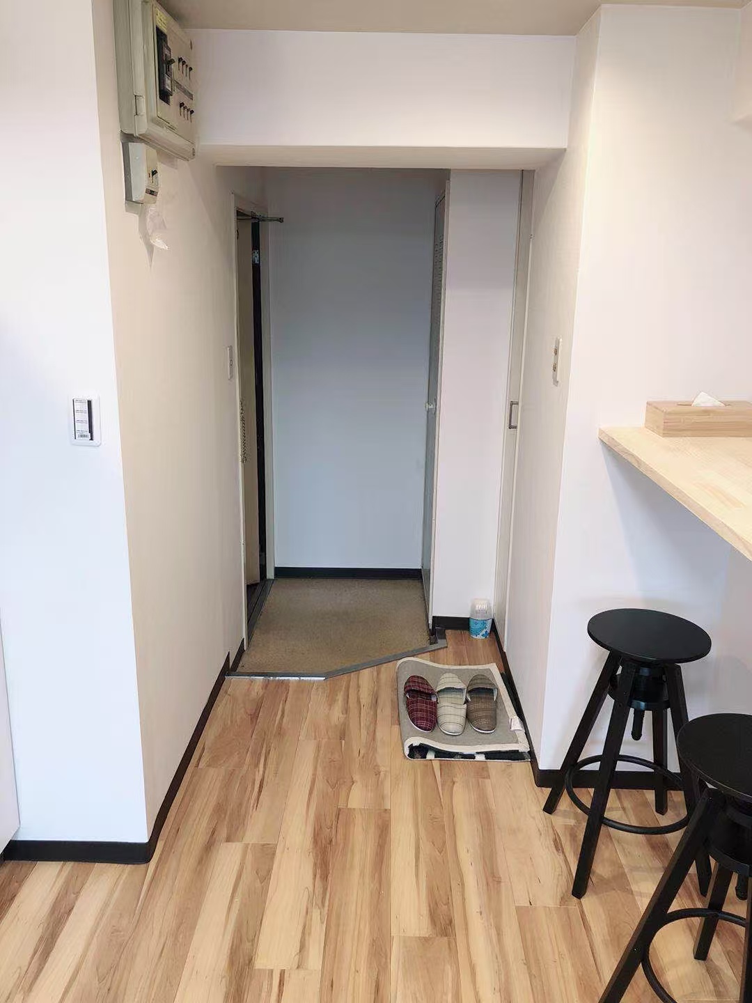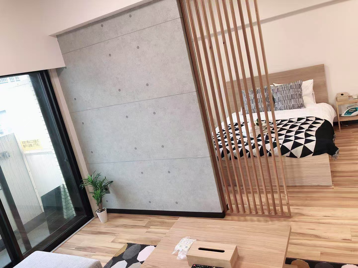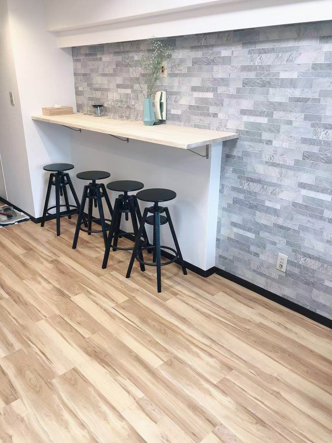 木目を基調としたやわらかな素材感に、白をベースとした明るい内装を合わせ、清潔感のある居住空間へと整えました。 ルーバーによる緩やかな仕切りやカウンターの設置により、ワンルームの中にも過ごし方の幅を持たせ、住まいとしての使いやすさを高めています。